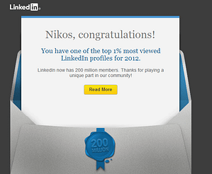 Το προφίλ που έχει στο LilnkedIn το 2012 ήταν στο Top1% με τις περισσότερες επισκέψεις.