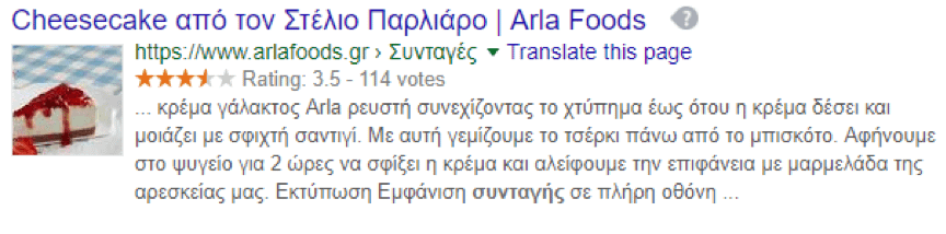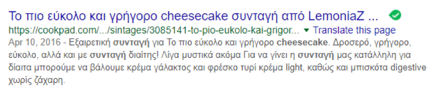 Το snippet είναι το αποτέλεσμα που βλέπει ο χρήστης σε κάθε Google αναζήτηση. Για παράδειγμα, αν ψάξουμε ‘’cheesecake συνταγη’’ θα μπορέσουμε να βρούμε αποτελέσματα με snippets και αποτελέσματα με rich snippets. Ένα απλό snippet εμφανίζεται έτσι:
